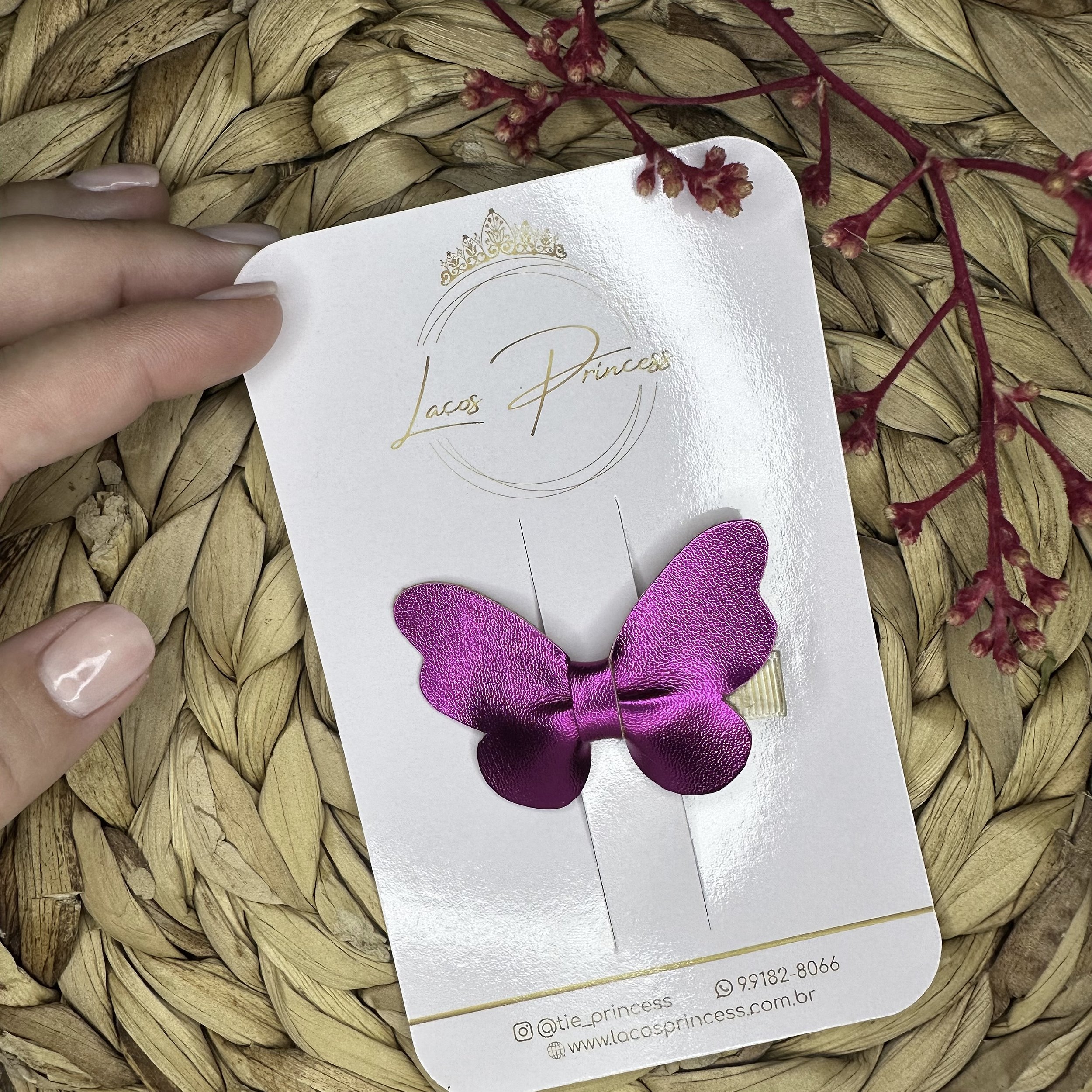 Clip Borboleta, feito a mão em couro ecológico, bico de pato semi encapado sem antiderrapante. Borboleta com aproximadamente 5 cm.